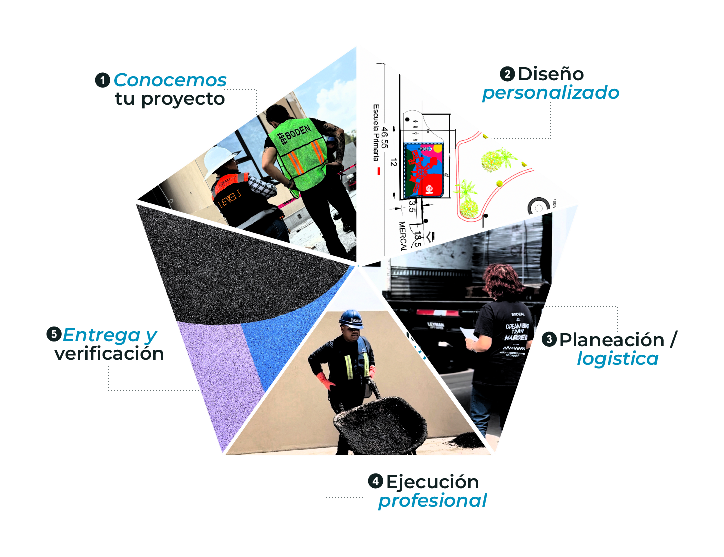 Dominamos cada componente, como el caucho SBR y las resinas para ofrecer superficies funcionales, personalizadas y de calidad comprobada.